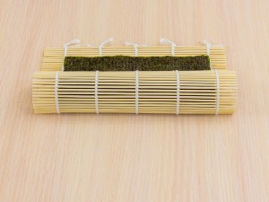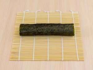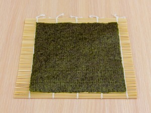 На бамбуковый коврик положить лист нори блестящей стороной вниз.