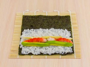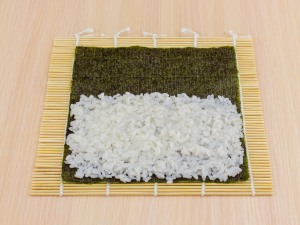 Рис выкладывать таким образом, чтобы сверху осталась полоска шириной 5–7 см (если вы используете лист нори 20×23 см).