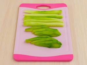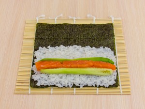 Отступив от нижнего края 1–2 см, выложить огурец, рыбу, авокадо.