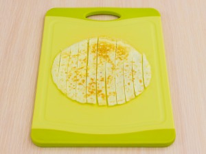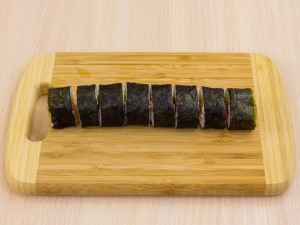 После этого выкладываем на разделочную доску, окунаем острый нож в воду с уксусом (это делается для того, чтобы рис не прилипал к ножу).