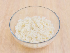 В готовый горячий рис добавить приправу с рисовым уксусом (на 400 г готового риса 3 ст.л.).