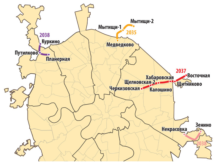 Помимо этого участка на тот же период запланировано продлить в Мытищи Калужско-Рижскую линию — на ней после «Медведково» появятся еще две станции. От «Преображенской пощади» метро пойдет ответвлением до поселка Восточный (там запланировано шесть станций). Таганско-Краснопресненская линия будет продлена от «Планерной» до Куркино через Путилково, а Бирюлевская — от «ЗИЛа» до «Тульской». А Троицкая линия поедет от того же пересадочного узла «ЗИЛ» до «Автозаводской».
