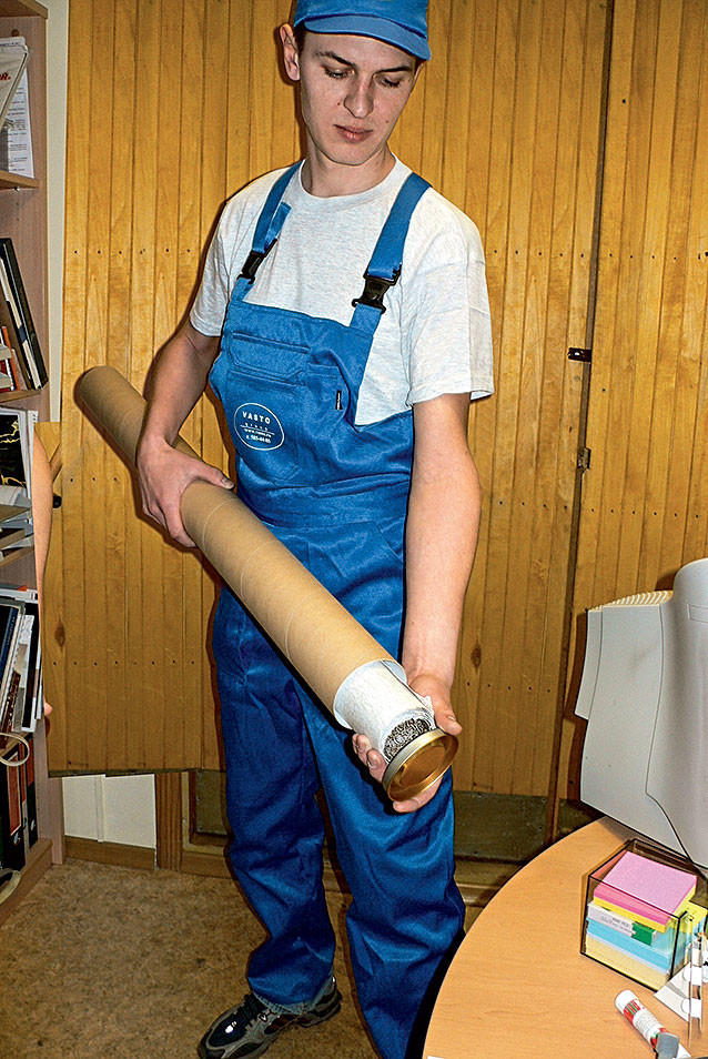Снимают скобы, открывают тубус, удаляют демпфирующие прокладки, переворачивают тубус и аккуратно вынимают рулон