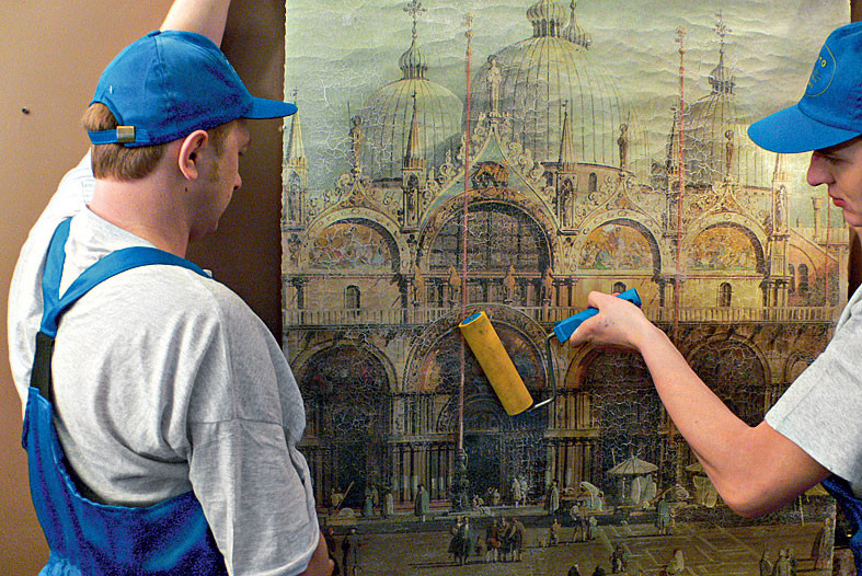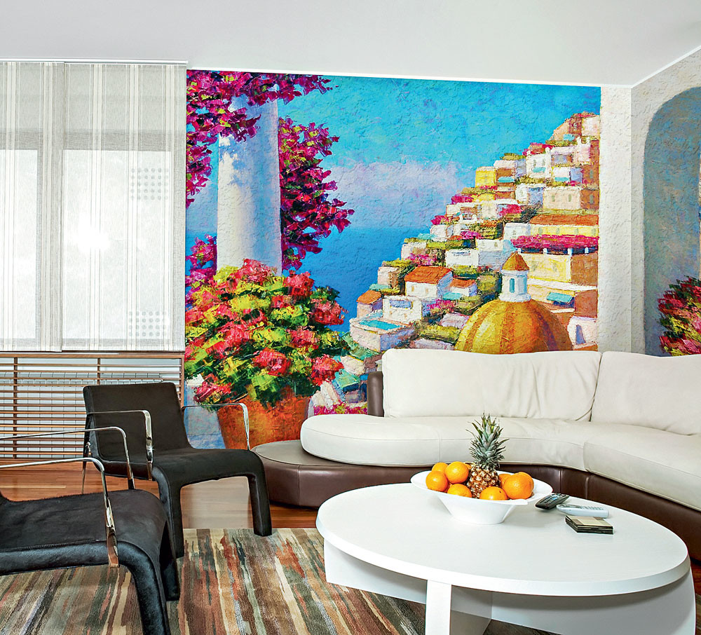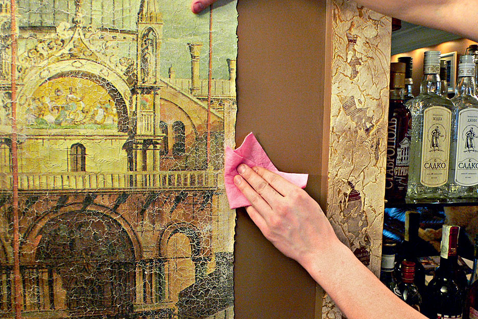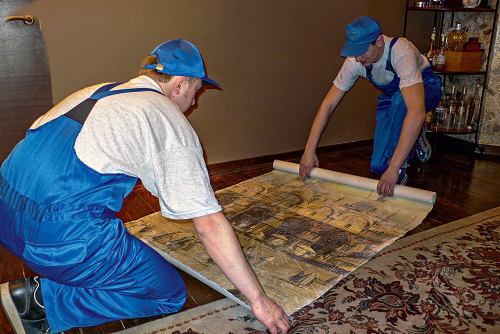 Эластичный штукатурный слой позволяет свернуть полотно современной фрески на флизелиновой основе в рулон, как обои. Его транспортировка и монтаж также напоминают работу с обоями. Однако следует помнить, что каждое полотно фрески большого формата имеет небольшие припуски (около 5 см) с двух сторон. При правильном монтаже одно из полотен заводят на другое так, чтобы совпал рисунок. Только в этом случае линия стыка будет незаметна. Уход за фресками на флизелиновой основе совсем несложен. Они легко переносят воздействие влажной салфетки, а в случае сильных загрязнений для очистки поверхности используют мыльный раствор и мягкую щётку.