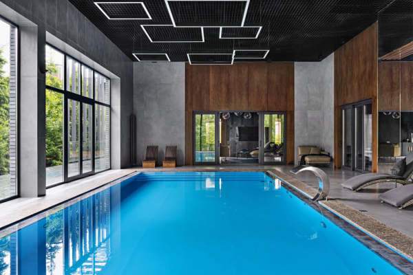 В зоне бассейна для потолка выбрали модульное решение грильято в сочетании с подвесными светильниками квадратной формы, расположенными на разной высоте.